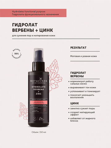 Эффективно снимает воспаления, успокаивая поврежденные участки, выравнивает рельеф. При регулярном использовании кожа приобретает тонус, красивую матовость и гладкость. Гидролат вербены с цинком подходит для экстренного освежающего ухода в течение всего дня, избавляет от жирного блеска, поддерживает макияж. Терпкий фруктово-лимонный аромат вербены со сладковатыми и прохладными нотами придает бодрости, наполняет чистотой и свежестью.