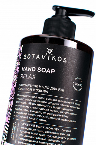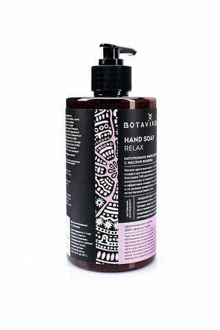 Hand Soap Relax Натуральное крем-мыло для рук с маслом жожоба и цветочной композицией 100% эфирных масел 98,6% натуральных ингредиентов Активный компонент – масло жожоба. Цветочная композиция 100% эфирных масел жасмина, иланг-иланга, розы дамасской, пачули, бергамота и герани. No silicone, no mineral oil, no PEG, no SLS/SLES, no paraben, no alcohol. Animal friendly. Мягкое цветочное мыло с легкой шелковистой пеной создано для ежедневного ухода за нежной кожей рук. Благодаря ПАВ растительного происхождения, полученному из кокосового масла, оно деликатно и эффективно очищает, не раздражая кожу и не вызывая аллергических реакций, поддерживая естественный баланс кожи. Активный компонент – жидкий воск жожоба, богатый аминокислотами, увлажняет и питает, придает коже заметную гладкость, ускоряет восстановительные процессы при повреждениях эпидермиса, проявляя свои регенерирующие способности. Чувственная композиция 100% эфирных масел, несущая благоухание роскошных цветов, – дарит истинное наслаждение от ароматерапии. Раскрываясь жаркими тропическими акцентами жасмина и иланг-иланга, символами неги и расслабления, аромат переходит к классическому дуэту женственной розы и пачули с его элегантной землистой нотой, оставляя позади звонкий цитрусовый всплеск бергамота и травянисто-виноградный – герани
