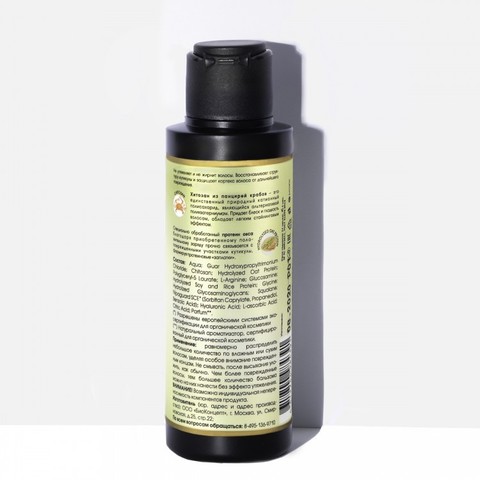 Состав: вода очищенная; катионный гуар* (Guar Hydroxypropyltrimonium Chloride); хитозан (Chitosan); гидролизованный протеин овса (Hydrolyzed Oat protein); эмолент из кокосового масла* (Polyglyceryl-5 Laurate); аргинин (L-Arginine); глюкозамин (Glucosamine); фитокератин (Hydrolyzed Soy and Rice Protein); глицин (Glycine); гидролизованные гликозаминогликаны (Hydrolized Glycosaminoglycans); сквалан (Squalane); мягкий консервант Nipaguard SCE* (Sorbitan Caprylate, Propanediol, Benzoic Acid), гиалуроновая кислота (Hyaluronic Acid); аскорбиновая кислота (L-ascorbic acid); лимонная кислота (Citric Acid); parfum**. (*) разрешены европейскими системами экосертификации для органической косметики (**) натуральный ароматизатор, сертифицированный для органической косметики